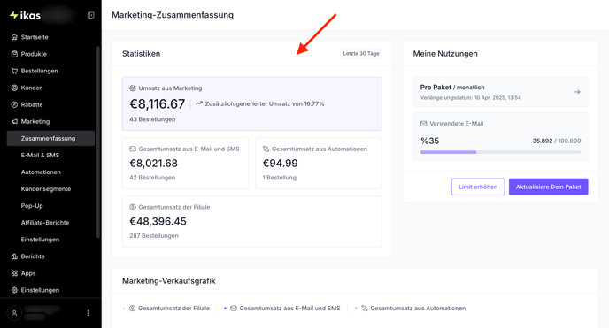 Die Statistiken zeigen Dir die Performance des ikas Marketings innerhalb der letzten 30 Tage und liefern wertvolle Einblicke in Deine Marketingmaßnahmen.