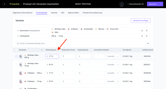 Scrolle auf der Produktdetailseite zum Abschnitt Varianten. Stelle zunächst sicher, dass der Verkaufspreis der betroffenen Variante eingetragen ist.