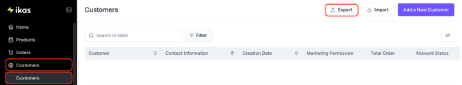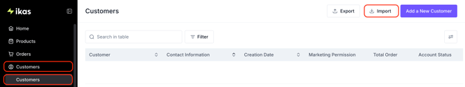 Import the File into the ikas Dashboard: Go back to the ikas dashboard under Customers > Customers.Click on Import, select Customer Properties, click Next, and select the updated file to import the customer data.