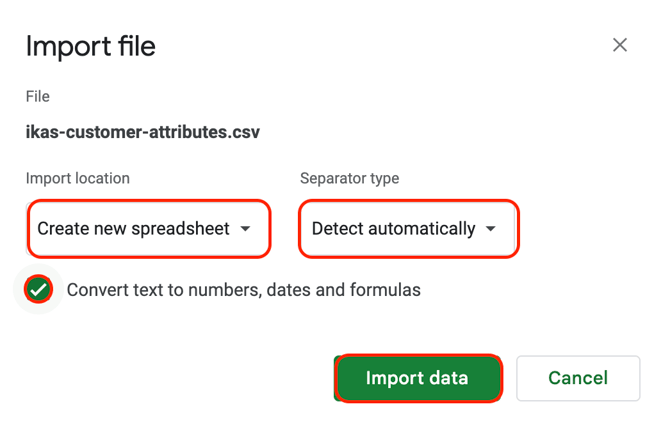 Keep the settings: Replace spreadsheet, Detect automatically, and check Convert text to numbers, dates, and formulas. Click Import data.