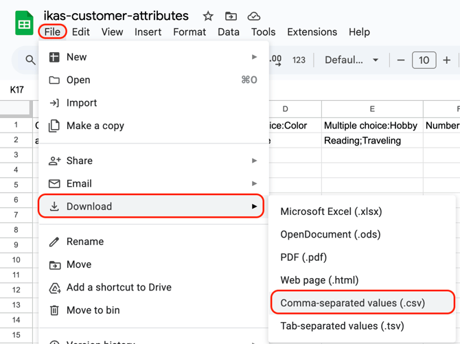 Click File > Download > Comma-separated values (CSV) to save the edited file.