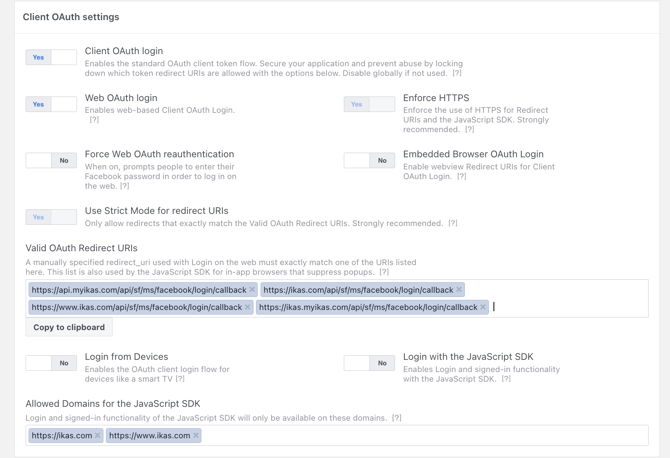 İlgili URI Oluşturucu aracı yerine manuel olarak ilerlemek istemeniz durumunda ise aşağıda verilen URL'leri Valid OAuth Redirect URLs ve Allowed Domains for the Javascript SDK kısımlarına girerek devam edebilirsiniz.